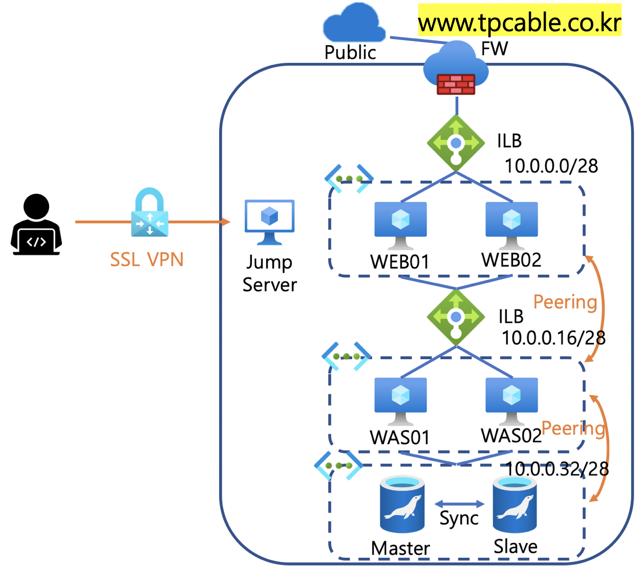 가상머신, 가상네트워크, P2S VPN, 경로 테이블, 피어링, 방화벽, LB, DNS영역, 가용성 집합