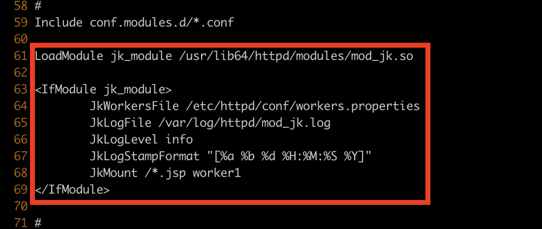 LoadModule jk_module /usr/lib64/httpd/modules/mod_jk.so (mod_jk.so 파일 위치)