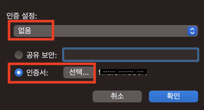 8. 인증설정: 없음, 인증서를 선택하고 개인키를 선택한다.(.pfx)
