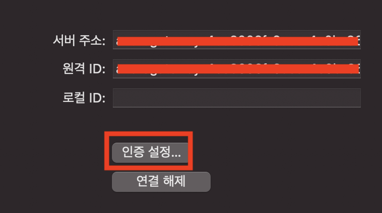7. 아래와 같이 설정하고 서버주소, 원격 ID 값은 앞에서 복사한 값을 붙여넣는다. 이후 인증 설정 선택