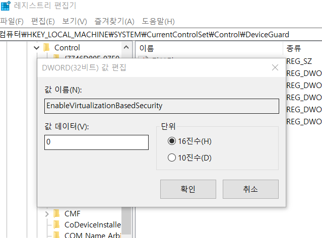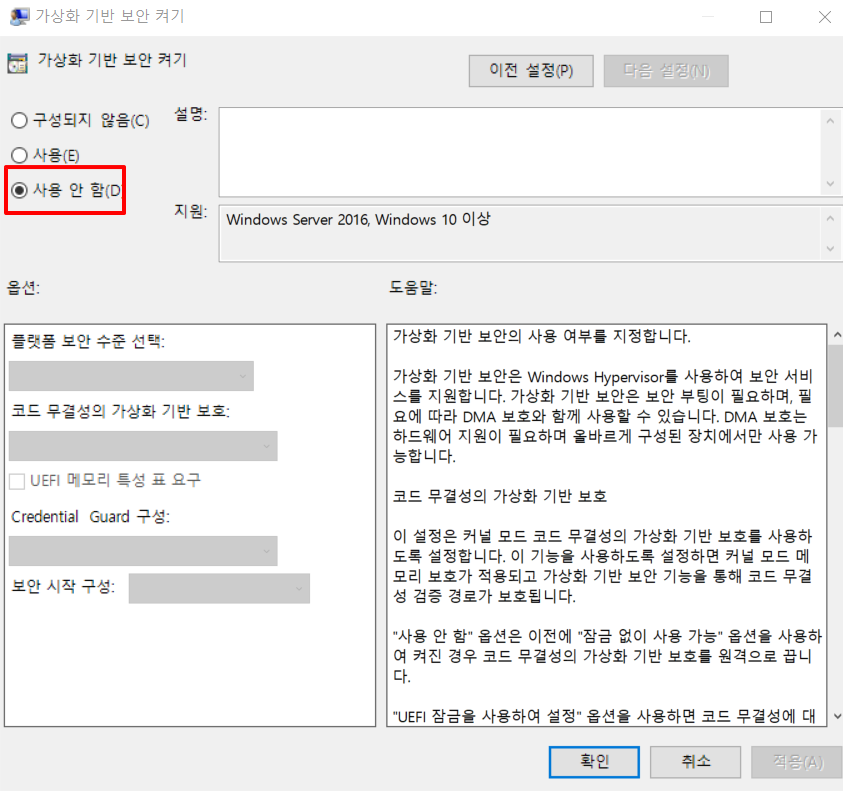 가상화 기반 보안 켜기 메뉴에서 비활성화한다.
