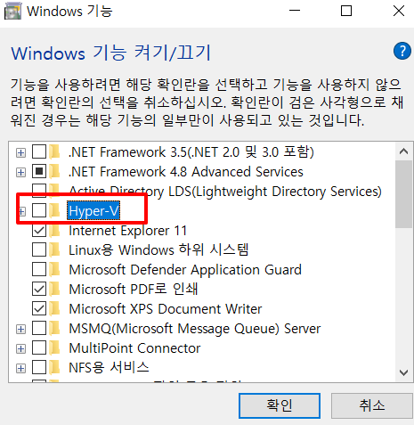 3. Windows 기능 켜기/끄기를 통해 Hyper - V 를 비활성화