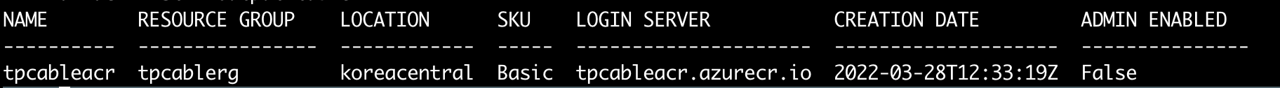 ➜ ~ az acr create -g tpcablerg -l koreacentral -n tpcableacr --sku basic